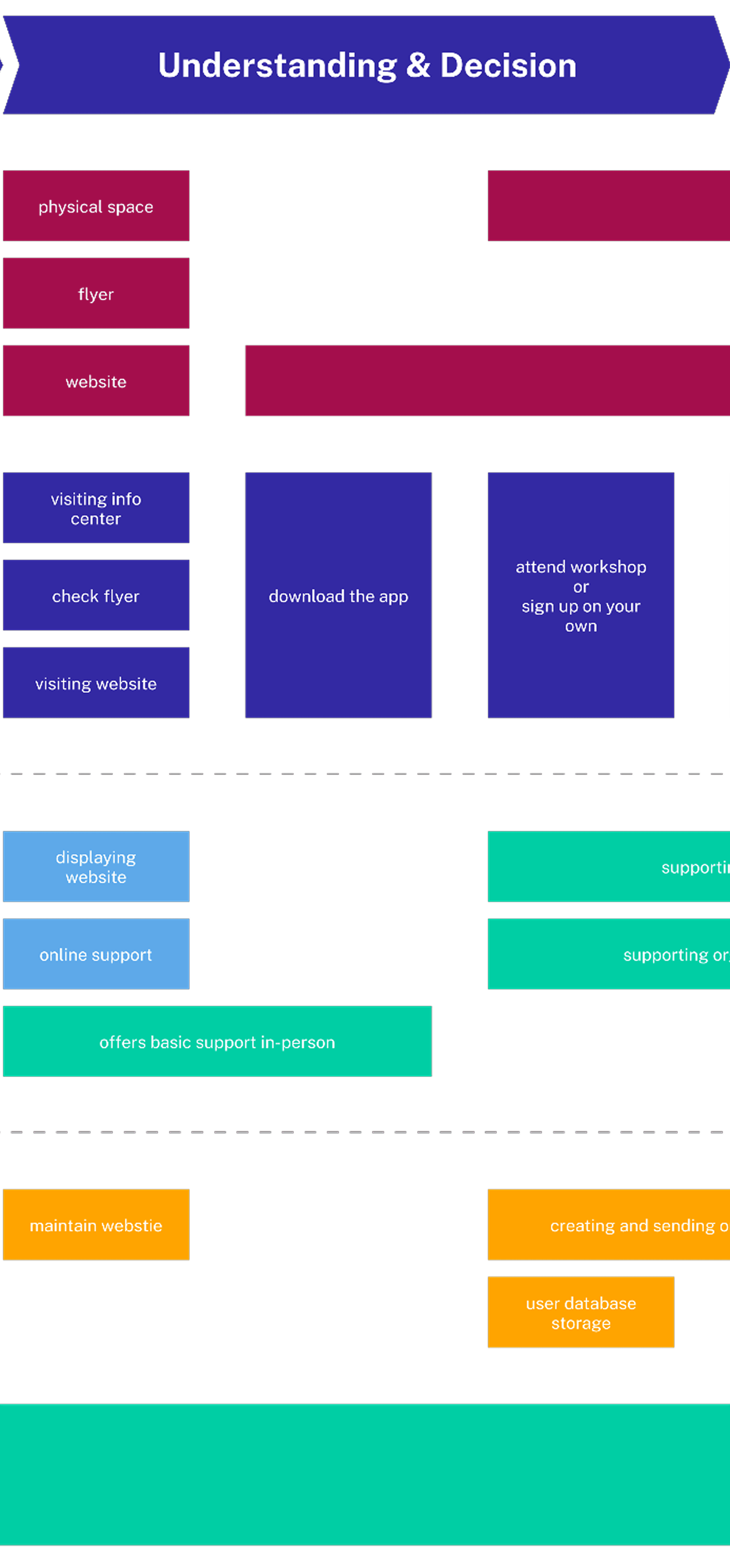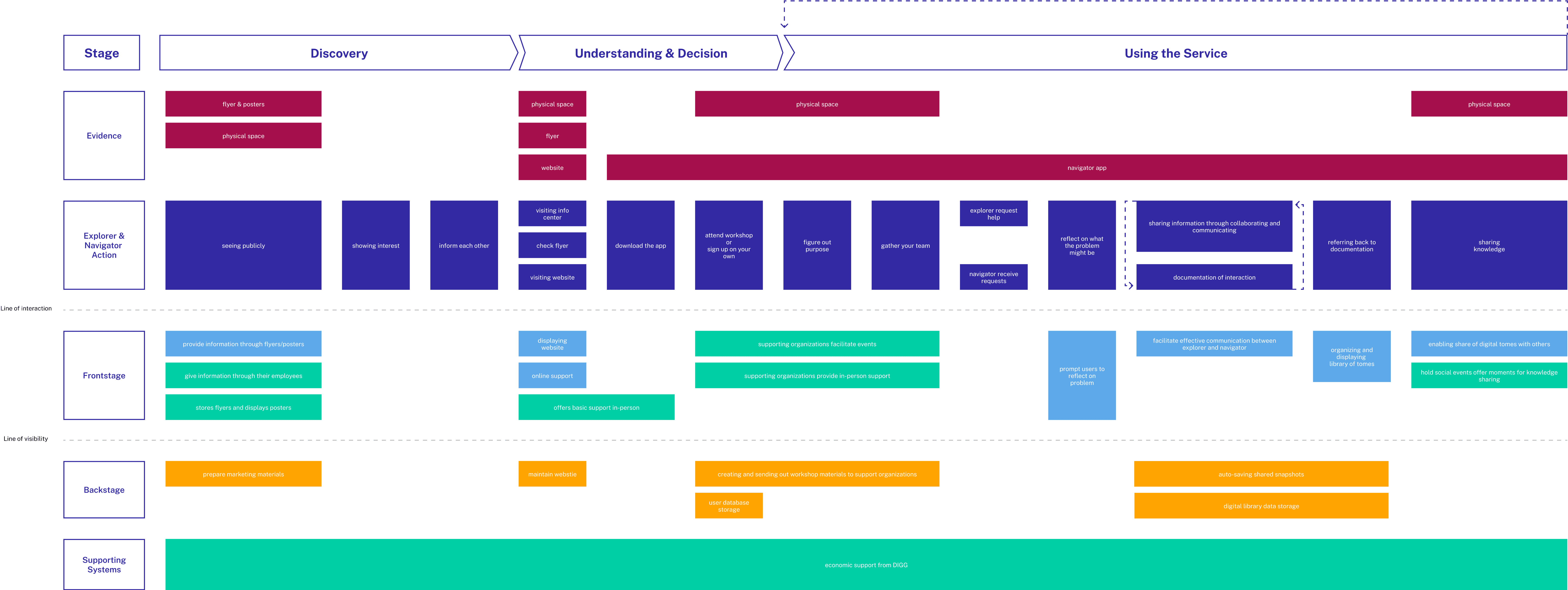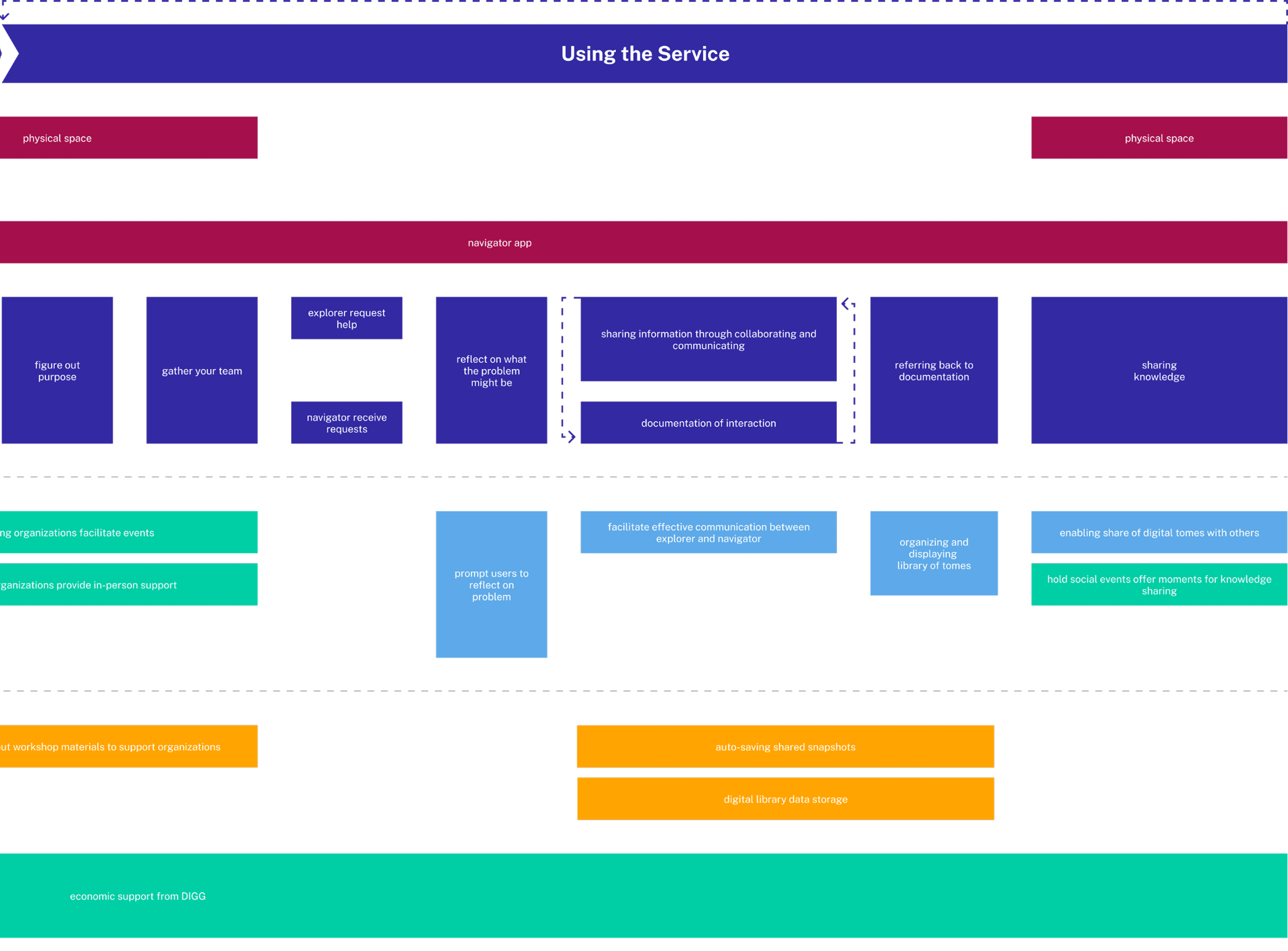 The service moves through three stages: discovering it via community touchpoints, onboarding through workshops or self-guided resources, and using the platform to share knowledge and gradually transition from explorer to navigator