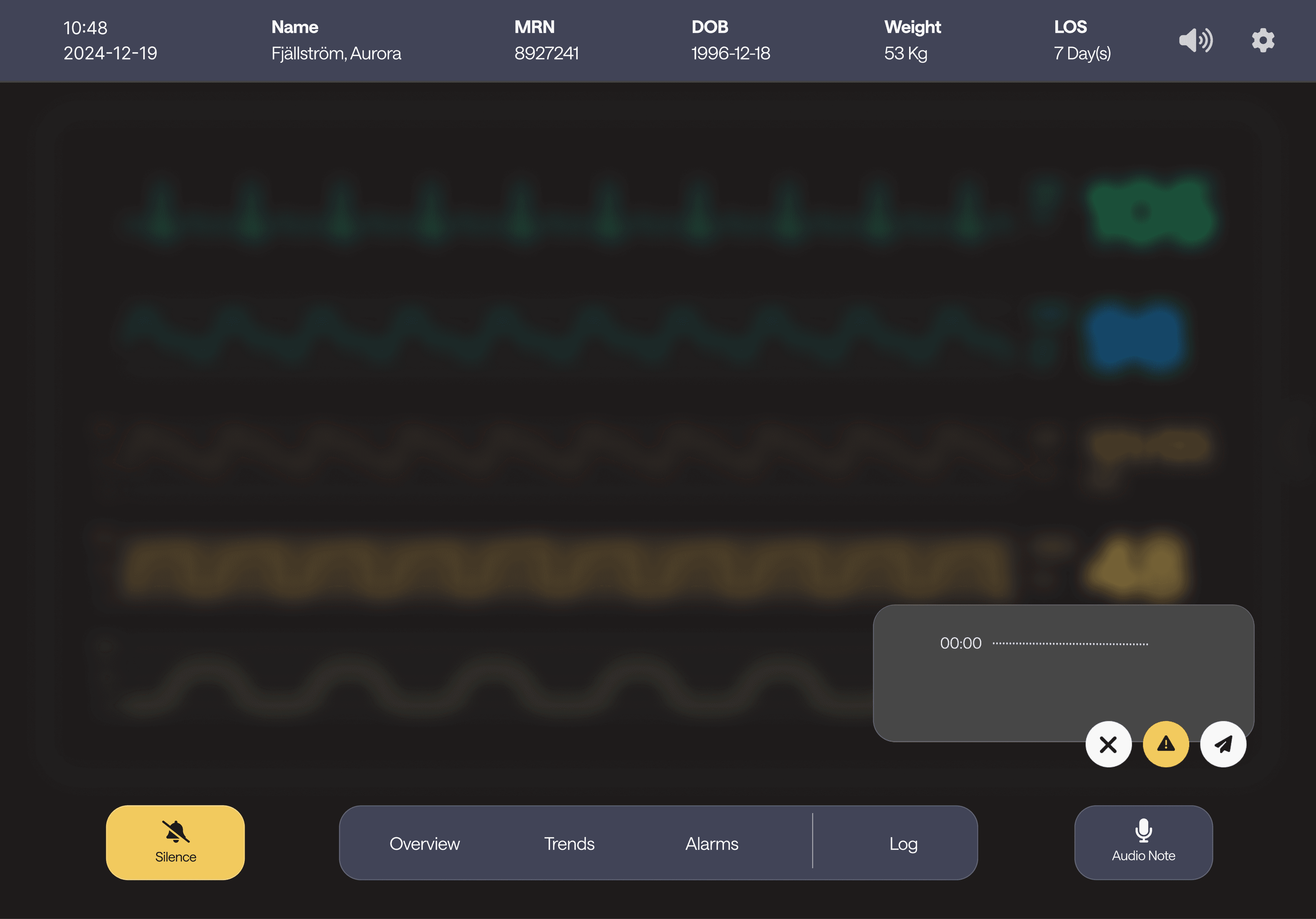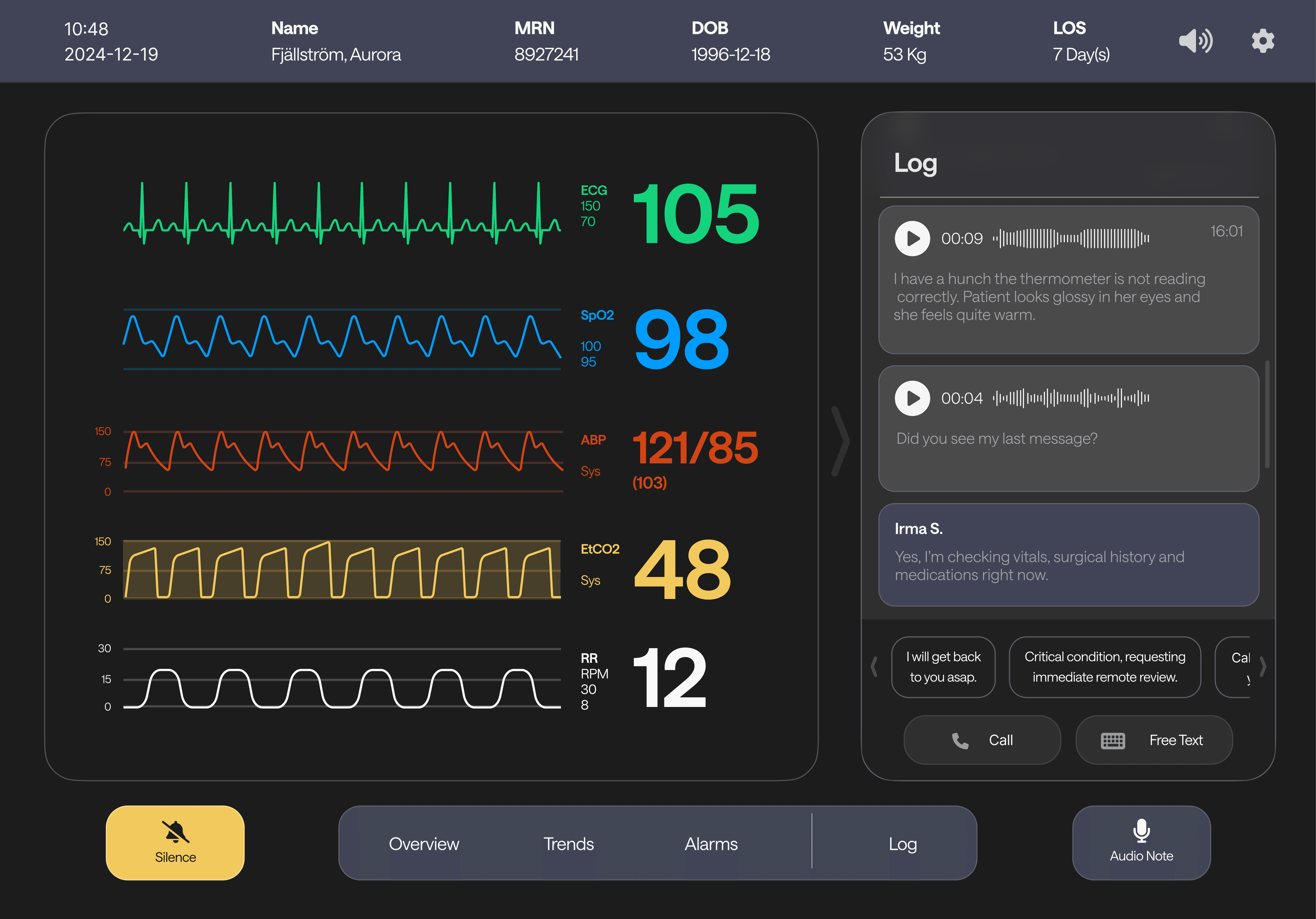 The waveform fills the screen by default. Nurses can send voice messages via the audio note button, automatically transcribed with edit and re-record options. The log also supports quick messages, calls, and text input for flexible, real-time collaboration