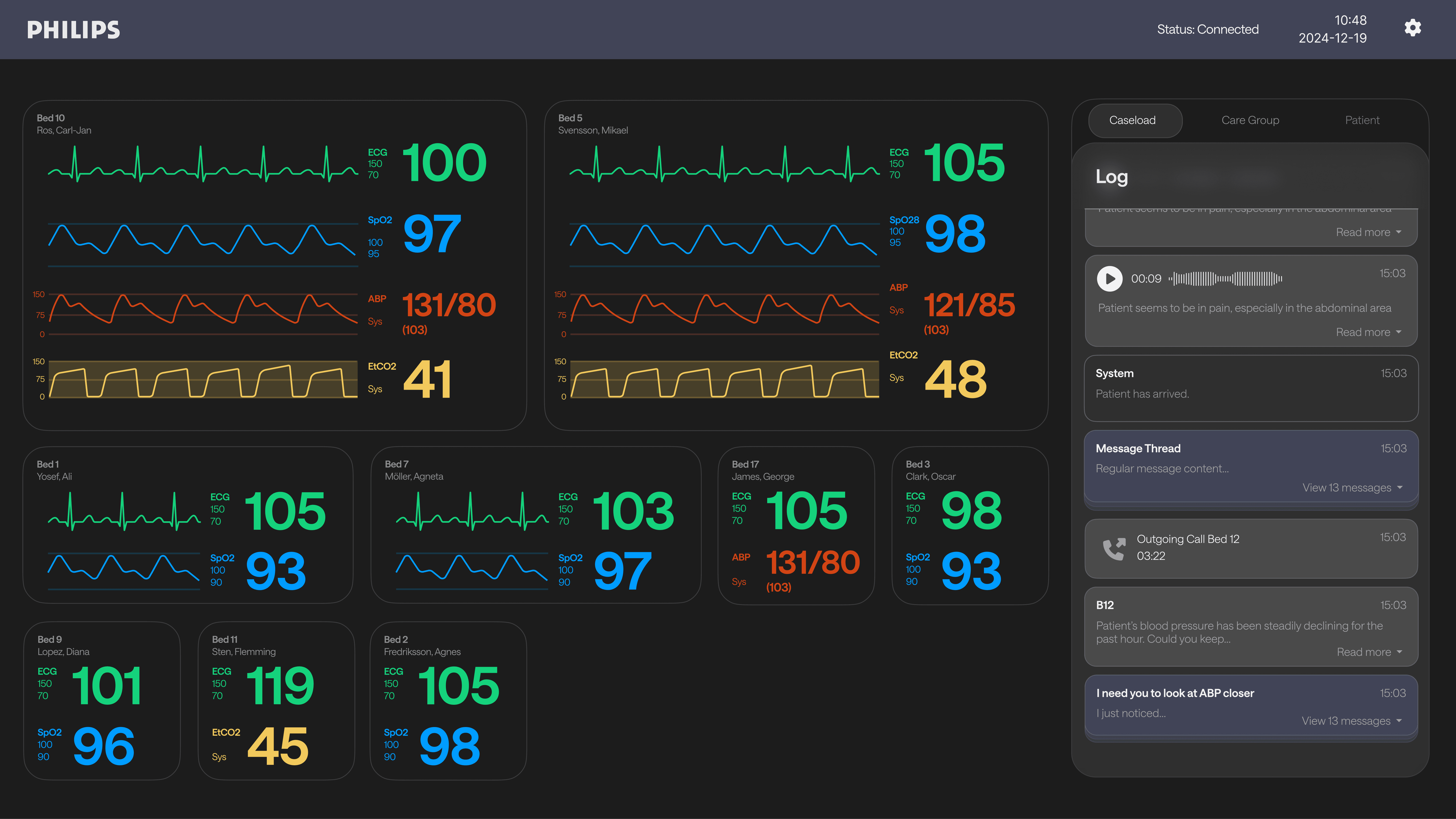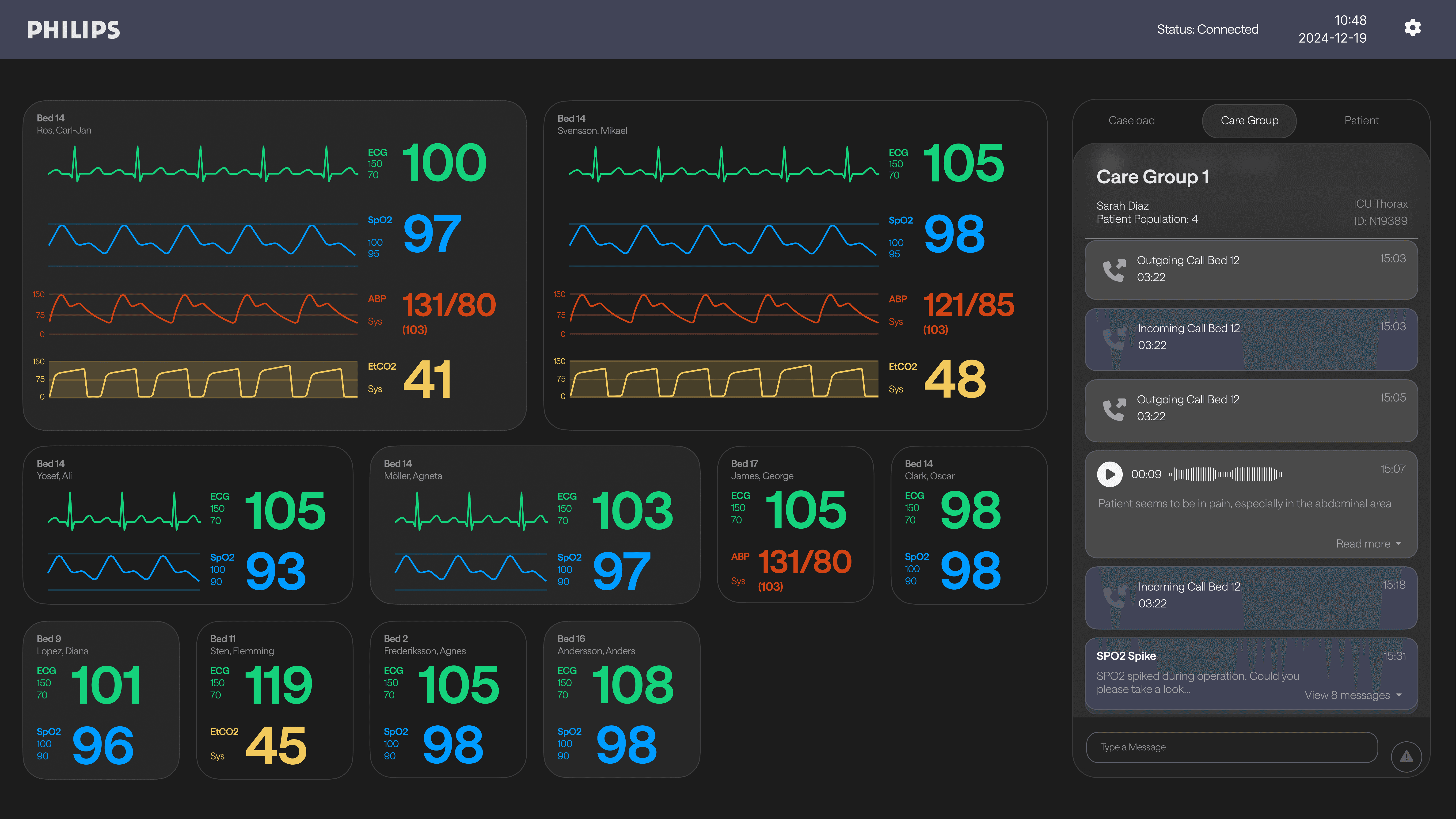 The telehealth interface uses dynamic patient cards that adjust size and detail based on urgency, highlighting different vitals and conditions for efficient prioritization. A message log on the right organizes all patient-related communication by tabs and time, supporting both general overviews and focused care group collaboration